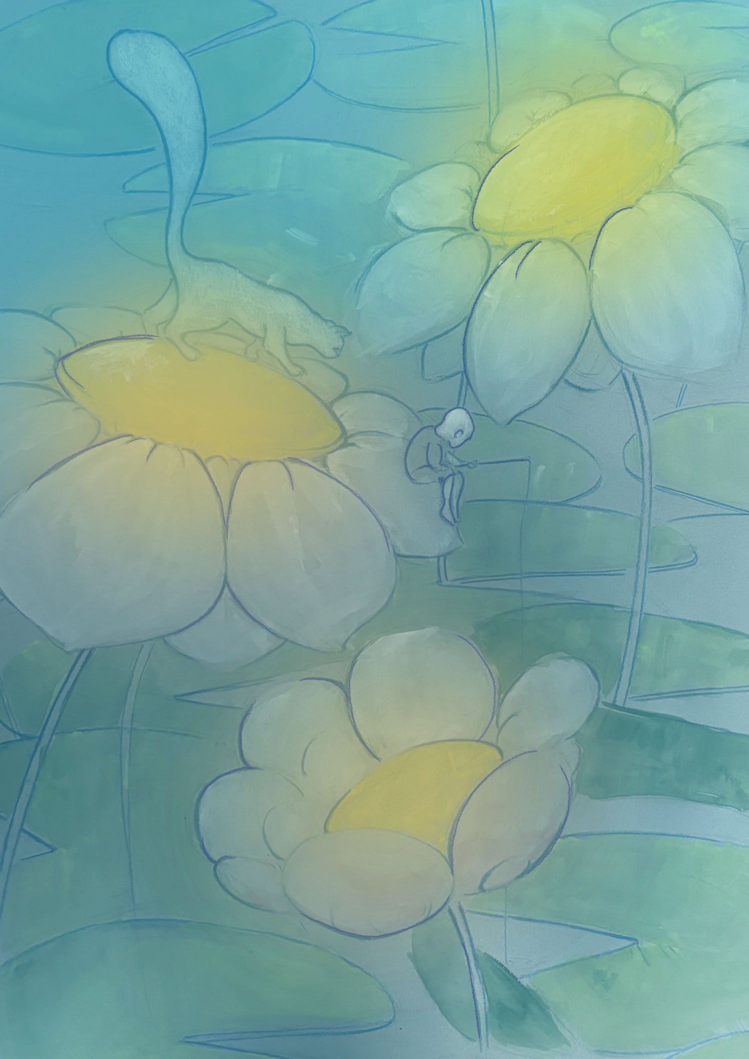 Jag använder främst traditionella tekniker som gouache, vattenfärg, pastell, blyerts eller färgpennor.